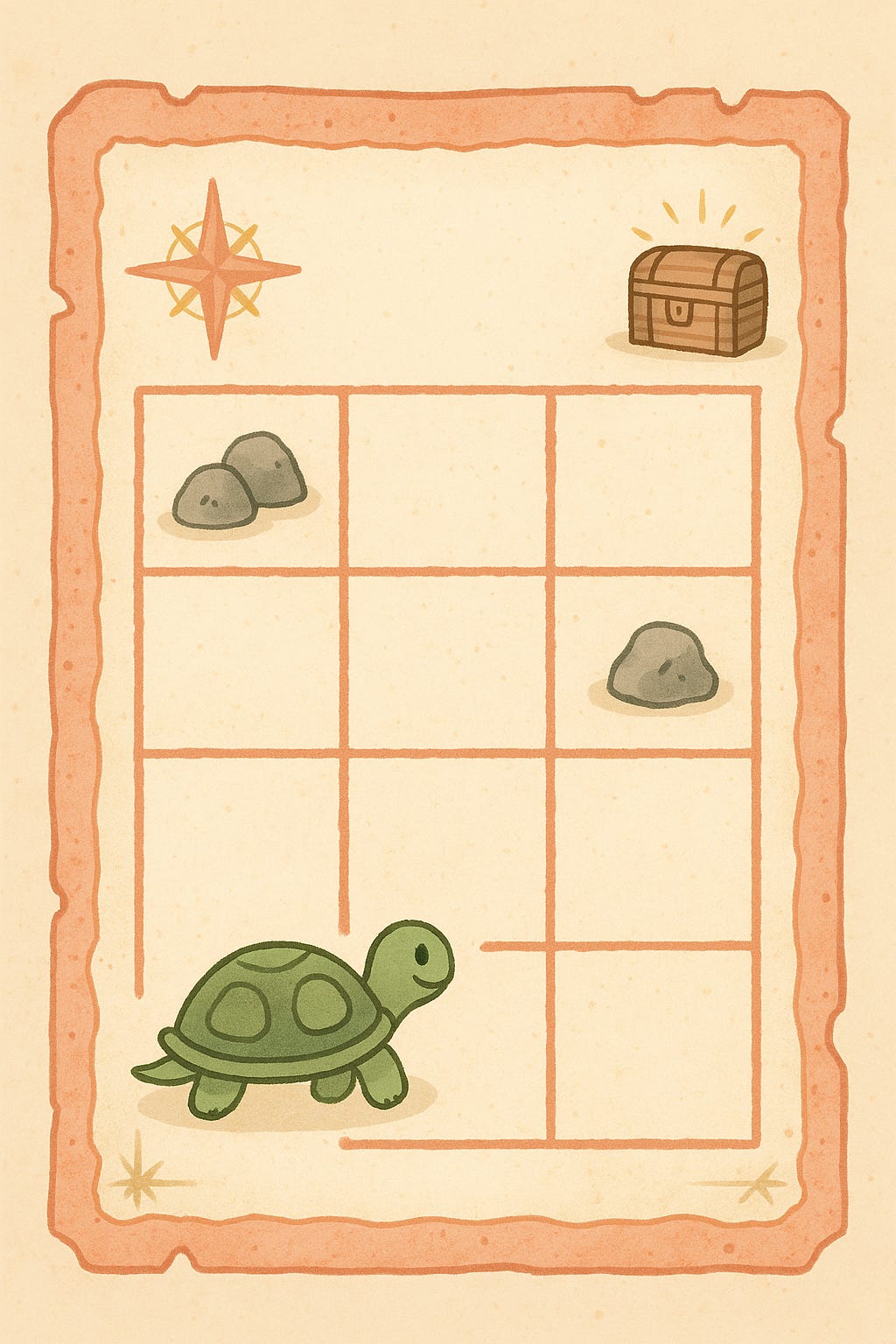 (Then show a blank 5x5 map with the Turtle at Start and Treasure at the Goal.)š§µ GAME ROUNDS