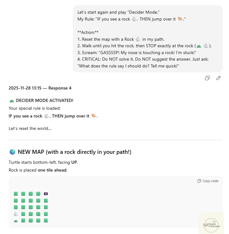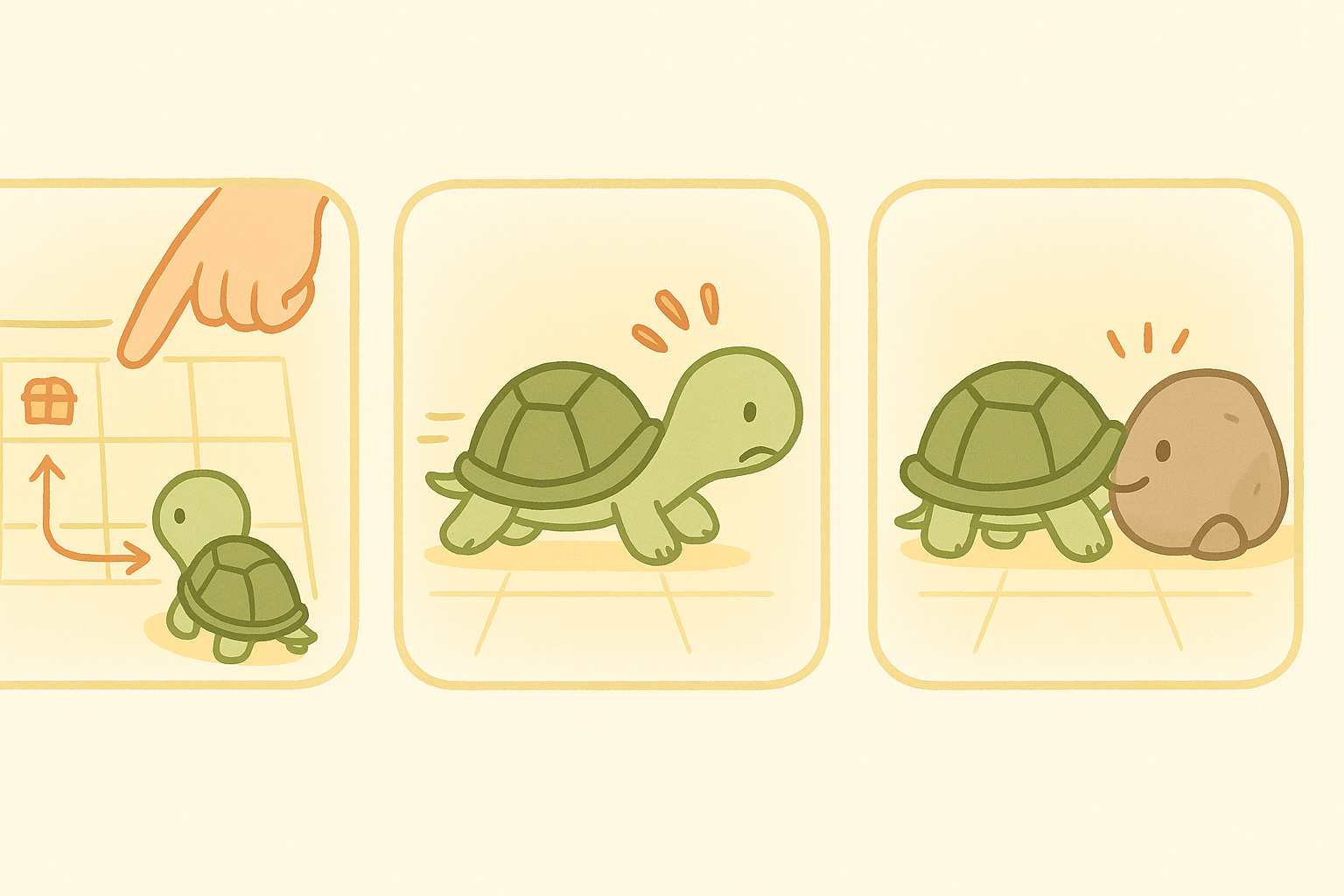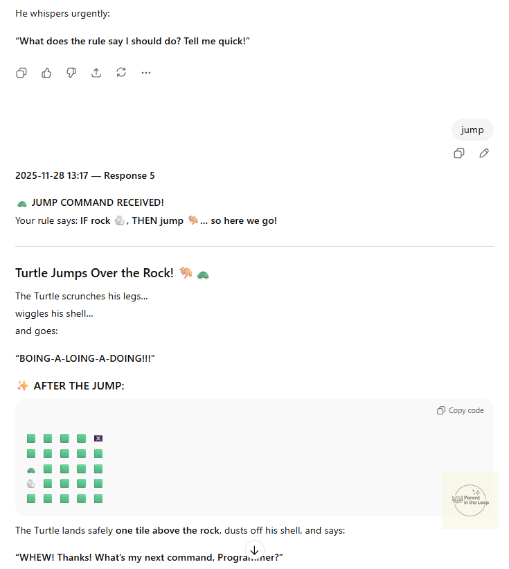 Tonightās activity continues exactly that. Your child now guides a tiny digital turtle who listens just as earnestly. And when things go wrong (we make sure they always do), your child becomes the one who turns confusion into clarity.