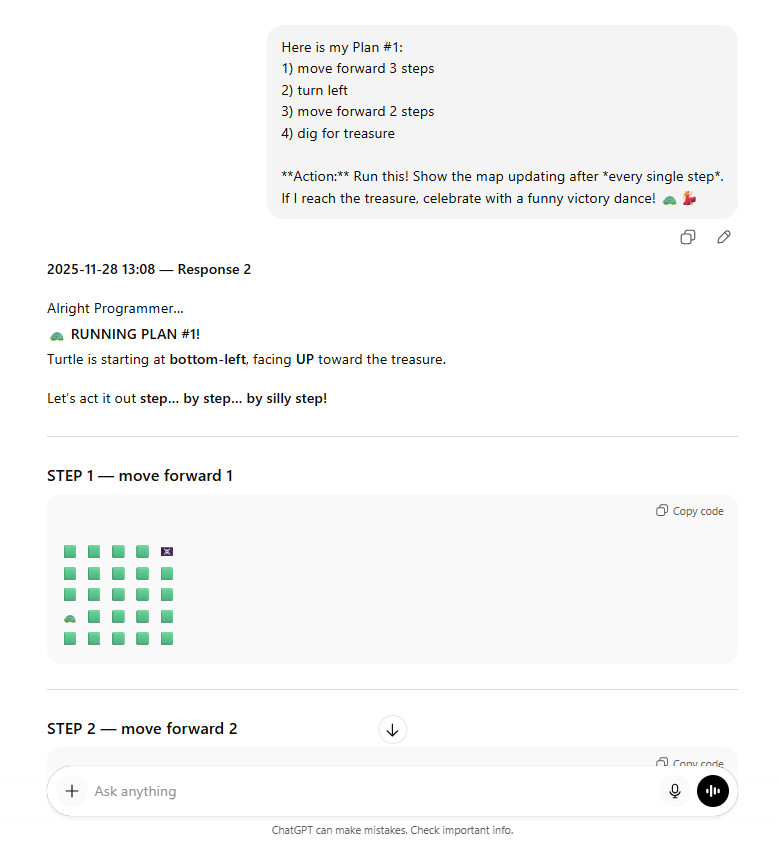 Kid challenge: Create a new map with one rock and treasure. Ask AI for a strategy; fix one bug.